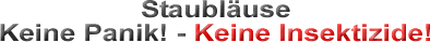 Die Schädlingsbekämpfungsmittel (Insektizide) können dieses Problem nicht dauerhaft lösen. Sobald die Schädlingsbekämpfungsmittel (Insektizide) abgeklungen sind, tauchen die Staubläuse wieder auf. Die Beseitigung der Feuchtigkeit ist hier gefragt und als Ursache anzusehen. Mit der Austrocknung des Gebäudes verlieren diese Insekten ihren Lebensraum und das Problem erledigt sich von selbst. Die angeblichen Gefahren werden oft völlig übertrieben und meist verzerrt dargestellt! Ein seriöser Schädlingsbekämpfer rät auf jeden Fall vom Einsatz von Schädlingsbekämpfungsmitteln (Insektiziden) ab und klärt sachlich über die oben angeführten Zusammenhänge auf.